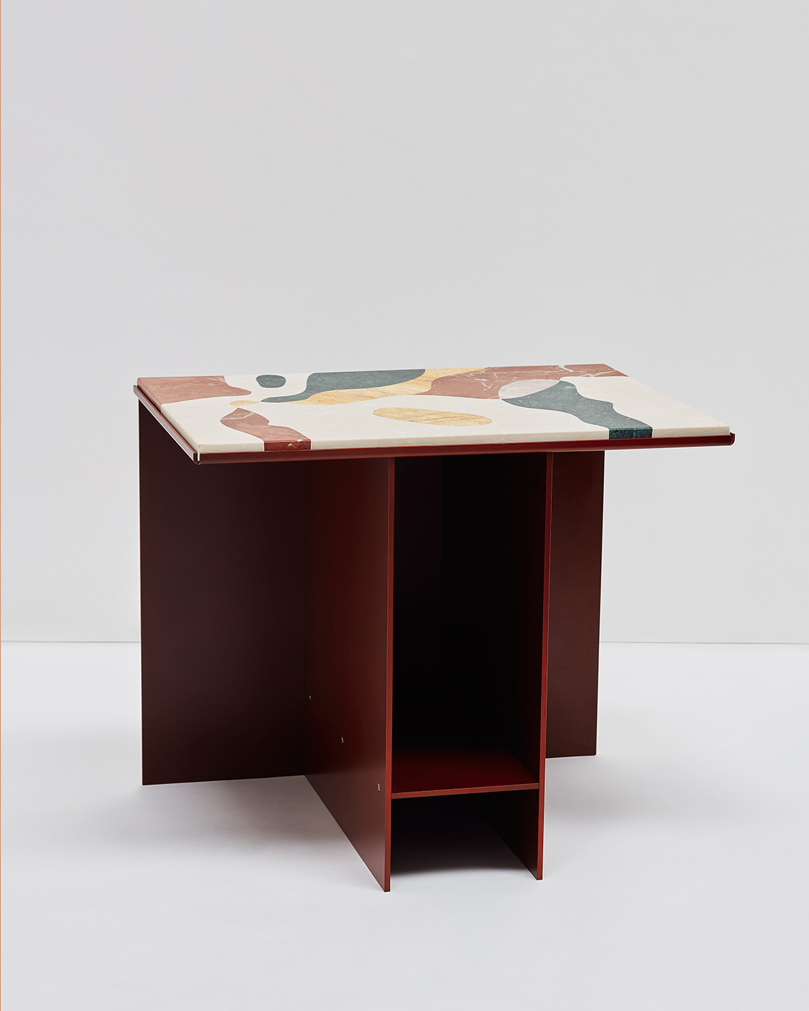 The design of the Uniform Table collection is all about contrast. A marble top cut by hand resting on top of an aluminum base that has been formed by machines. The natural movement of the marble’s veining along with the intricacies of the handmade inlaid patterns directly contrast to the precise lines and folds of the metal base.